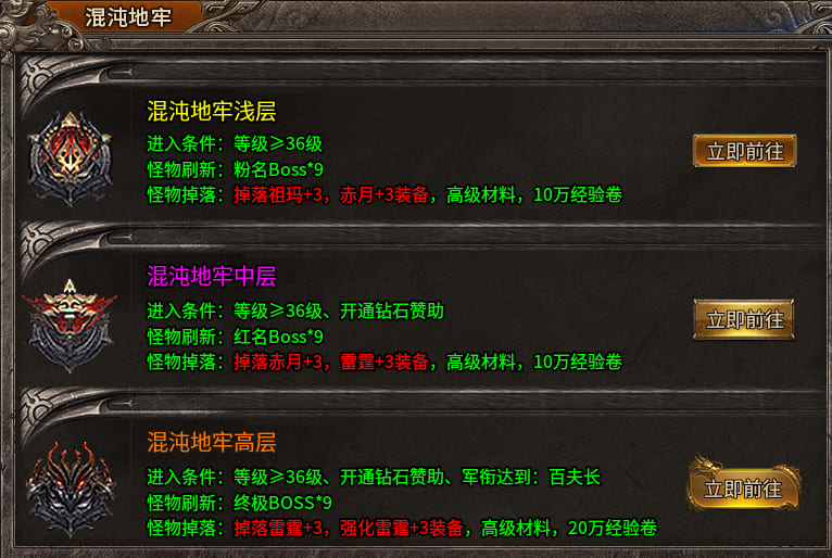 - 血月荒原:高级挑战区,爆率极高,BOSS具备多段技能机制,击败可获传说装备。